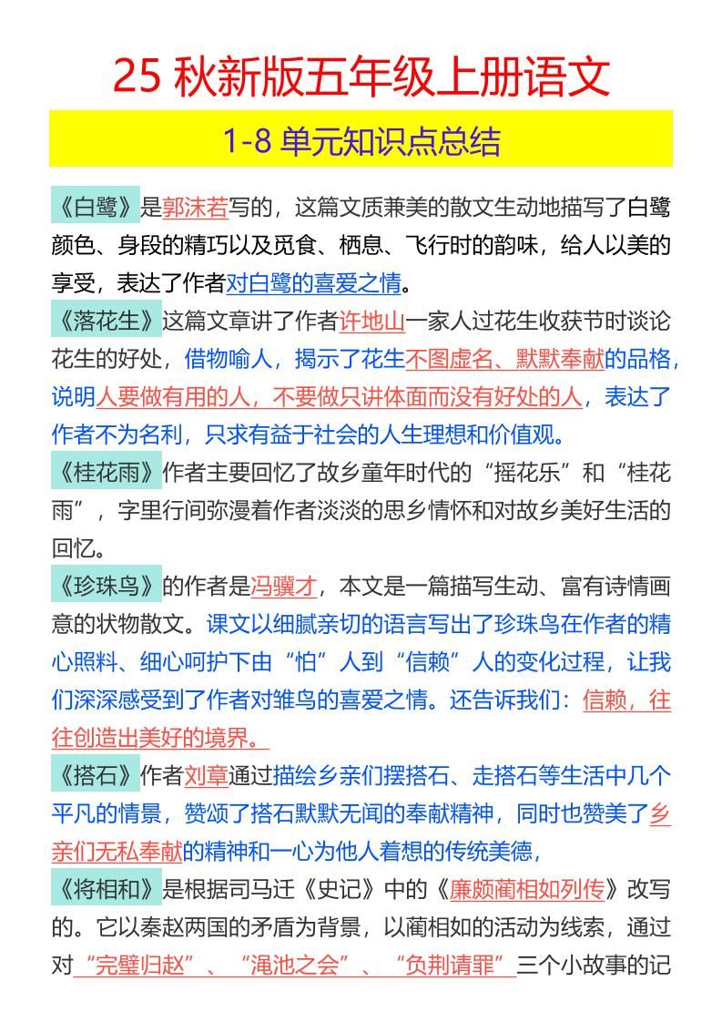【2025秋新版】五年级上册语文1-8单元知识点总结明哥2025年7月30日 02:01更新关注私信03312 ——预览已结束,还剩3页未读——开通会员后可免费下载高清完整文档 温馨提示:本文最后更新于2025-07-30 02:01:21,某些文章具有时效性,若有错误或已失效,请在下方留言或联系站长。 【2025秋新版】五年级上册语文1-8单元知识点总结此内容为付费资源,请付费后查看¥4.9SVIP免费立即购买您当前未登录!建议登陆后购买,可保存购买订单网络收集虚拟资源自动发货永久使用付费资源已售 52© 版权声明 1 如果您喜欢本站,开通会员赞助下本站,感谢支持! 2 可能会帮助到你: 下载帮助 | 报毒说明 | 进站必看 | 广告合作; 3 本站素材资源不代表本站立场,并不代表本站赞同其观点和对其真实性负责; 4 本站大部分素材资源来源于网络,仅供学习与参考,请于下载后24小时内删除; 5 若作商业用途,请联系原作者授权,若本站侵犯了您的权益请 联系站长 进行删除处理; 6 如若转载,请注明文章出处: THE END语文 喜欢就支持一下吧点赞12 分享QQ空间微博QQ好友海报分享复制链接收藏