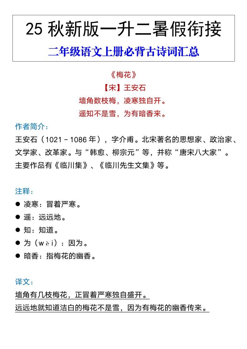 【2025秋新版】二年级语文上册必背古诗词汇总明哥2025年7月31日 10:29更新关注私信03516 ——预览已结束,还剩4页未读——开通会员后可免费下载高清完整文档 温馨提示:本文最后更新于2025-07-31 10:29:27,某些文章具有时效性,若有错误或已失效,请在下方留言或联系站长。 【2025秋新版】二年级语文上册必背古诗词汇总此内容为付费资源,请付费后查看¥4.9SVIP免费立即购买您当前未登录!建议登陆后购买,可保存购买订单网络收集虚拟资源自动发货永久使用付费资源已售 56© 版权声明 1 如果您喜欢本站,开通会员赞助下本站,感谢支持! 2 可能会帮助到你: 下载帮助 | 报毒说明 | 进站必看 | 广告合作; 3 本站素材资源不代表本站立场,并不代表本站赞同其观点和对其真实性负责; 4 本站大部分素材资源来源于网络,仅供学习与参考,请于下载后24小时内删除; 5 若作商业用途,请联系原作者授权,若本站侵犯了您的权益请 联系站长 进行删除处理; 6 如若转载,请注明文章出处: THE END语文 喜欢就支持一下吧点赞16 分享QQ空间微博QQ好友海报分享复制链接收藏