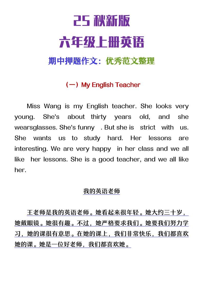 【2025秋新版】六年级上册英语期中押题作文优秀范文整理明哥2025年8月29日 16:12更新关注私信02613 ——预览已结束,还剩3页未读——开通会员后可免费下载高清完整文档 温馨提示:本文最后更新于2025-08-29 16:12:07,某些文章具有时效性,若有错误或已失效,请在下方留言或联系站长。 【2025秋新版】六年级上册英语期中押题作文优秀范文整理此内容为付费资源,请付费后查看¥4.9SVIP免费立即购买您当前未登录!建议登陆后购买,可保存购买订单网络收集虚拟资源自动发货永久使用付费资源已售 53© 版权声明 1 如果您喜欢本站,开通会员赞助下本站,感谢支持! 2 可能会帮助到你: 下载帮助 | 报毒说明 | 进站必看 | 广告合作; 3 本站素材资源不代表本站立场,并不代表本站赞同其观点和对其真实性负责; 4 本站大部分素材资源来源于网络,仅供学习与参考,请于下载后24小时内删除; 5 若作商业用途,请联系原作者授权,若本站侵犯了您的权益请 联系站长 进行删除处理; 6 如若转载,请注明文章出处: THE END英语 喜欢就支持一下吧点赞13 分享QQ空间微博QQ好友海报分享复制链接收藏