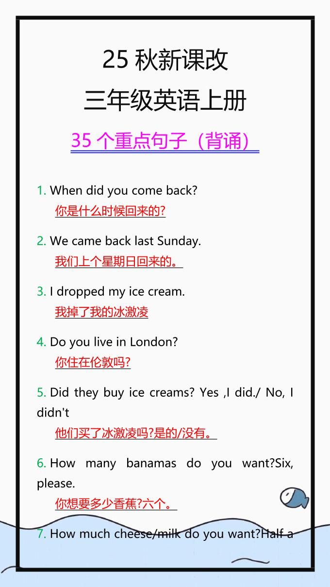 【2025秋新版】三年级英语上册35个重点句子,收藏背一背!明哥2025年8月31日 18:06更新关注私信02415 ——预览已结束,还剩3页未读——开通会员后可免费下载高清完整文档 温馨提示:本文最后更新于2025-08-31 18:06:38,某些文章具有时效性,若有错误或已失效,请在下方留言或联系站长。 【2025秋新版】三年级英语上册35个重点句子,收藏背一背!此内容为付费资源,请付费后查看¥4.9SVIP免费立即购买您当前未登录!建议登陆后购买,可保存购买订单网络收集虚拟资源自动发货永久使用付费资源已售 63© 版权声明 1 如果您喜欢本站,开通会员赞助下本站,感谢支持! 2 可能会帮助到你: 下载帮助 | 报毒说明 | 进站必看 | 广告合作; 3 本站素材资源不代表本站立场,并不代表本站赞同其观点和对其真实性负责; 4 本站大部分素材资源来源于网络,仅供学习与参考,请于下载后24小时内删除; 5 若作商业用途,请联系原作者授权,若本站侵犯了您的权益请 联系站长 进行删除处理; 6 如若转载,请注明文章出处: THE END英语 喜欢就支持一下吧点赞15 分享QQ空间微博QQ好友海报分享复制链接收藏