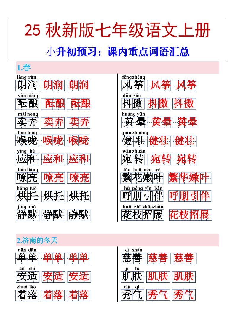 【2025秋新版】七年级上册语文课内重点词语汇总明哥2025年10月11日 10:06更新关注私信02413 ——预览已结束,还剩3页未读——您已获得此文档下载权限,请点击底部下载完整文档 温馨提示:本文最后更新于2025-10-11 10:06:50,某些文章具有时效性,若有错误或已失效,请在下方留言或联系站长。 【2025秋新版】七年级上册语文课内重点词语汇总此内容为付费资源,请付费后查看¥4.9SVIP免费立即购买您当前未登录!建议登陆后购买,可保存购买订单网络收集虚拟资源自动发货永久使用付费资源已售 62© 版权声明 1 如果您喜欢本站,开通会员赞助下本站,感谢支持! 2 可能会帮助到你: 下载帮助 | 报毒说明 | 进站必看 | 广告合作; 3 本站素材资源不代表本站立场,并不代表本站赞同其观点和对其真实性负责; 4 本站大部分素材资源来源于网络,仅供学习与参考,请于下载后24小时内删除; 5 若作商业用途,请联系原作者授权,若本站侵犯了您的权益请 联系站长 进行删除处理; 6 如若转载,请注明文章出处: THE END语文 喜欢就支持一下吧点赞13 分享QQ空间微博QQ好友海报分享复制链接收藏